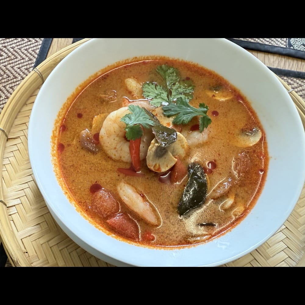 Dive into our Tom Yum, a beloved Thai classic that embodies the spirit of the East Isan region with its bold hot and sour notes. Each spoonful offers a delightful balance of flavors derived from fresh shallots, plump mushrooms, and juicy tomatoes, all harmoniously enhanced by the aromatic lime leaves, galangal, and lemongrass. Just the right kick of chili oil elevates this soup, creating a vibrant dish that warms the soul and tantalizes the taste buds, making it a must-try for anyone seeking an authentic taste of Thailand.